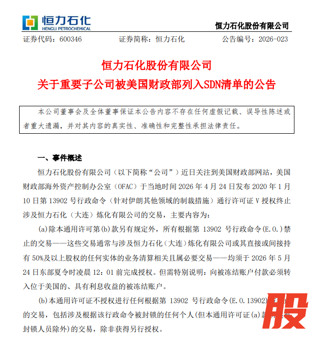 4月26日,恒力石化公告称,近日关注到美国财政部海外资产控制办公室(OFAC)将重要子公司恒力石化(大连)炼化有限公司列入SDN清单。